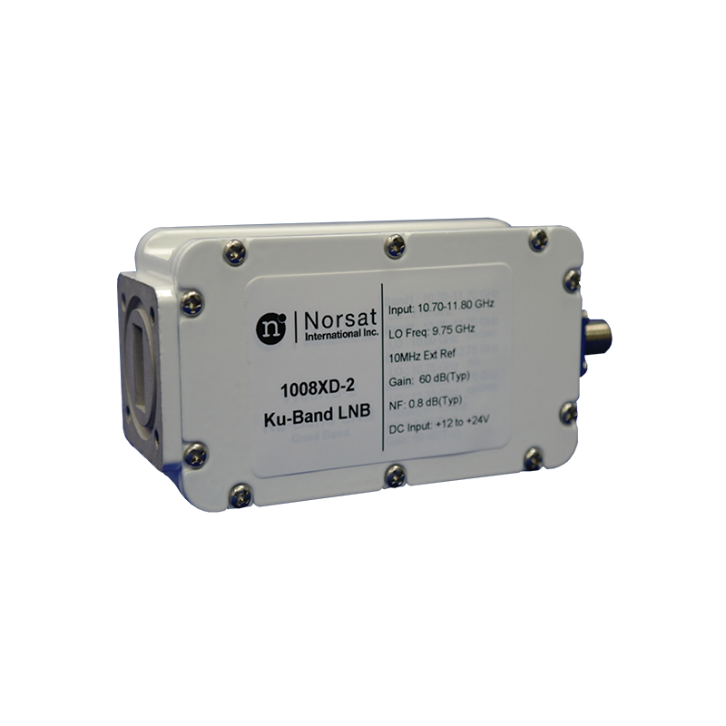 The Norsat 1008XD-2 is a single-band Ku-Band PLL LNB requiring a 10 MHz external reference. Covering 10.70–11.80 GHz with a 9.75 GHz LO, it delivers a typ. 0.8 dB noise figure, stable gain, and rugged IP67-rated housing for reliable SATCOM reception.