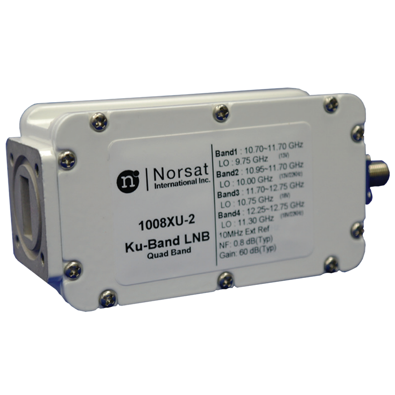 The Norsat 1008XUF is a quad-band Ku-Band external reference LNB designed for reliable SATCOM downlinking. With four switchable local oscillators, 0.8 dB typ. noise figure, and IP67 protection, it delivers high performance across 10.70–12.75 GHz for professional satellite communications.