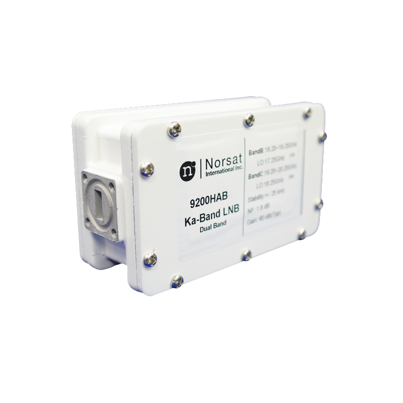 The Norsat 9500HBCN is a Ka-Band dual-band PLL LNB designed for precision SATCOM downlinking. Covering 19.20–20.20 GHz and 20.20–21.20 GHz, it offers typ. 1.5 dB noise figure, ±50 kHz stability, and rugged IP67 protection for reliable operation in demanding conditions.
